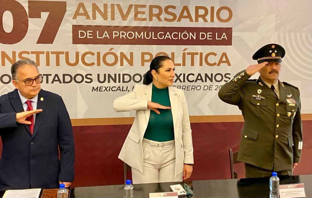 Mexicali, B.C., lunes 05 de febrero de 2024.- En el marco de la celebración del 107 Aniversario de la promulgación de la Constitución Política de 1917, la presidenta del Congreso del Estado, diputada Araceli Geraldo Núñez, participó en la ceremonia cívica encabezada por el Gobierno del Estado, donde resaltó que «como representantes del pueblo es imperativo recordar la importancia de este legado y renovar el compromiso con los principios fundamentales que defiende, ya que es un documento que ha moldeado el destino de México durante décadas».
