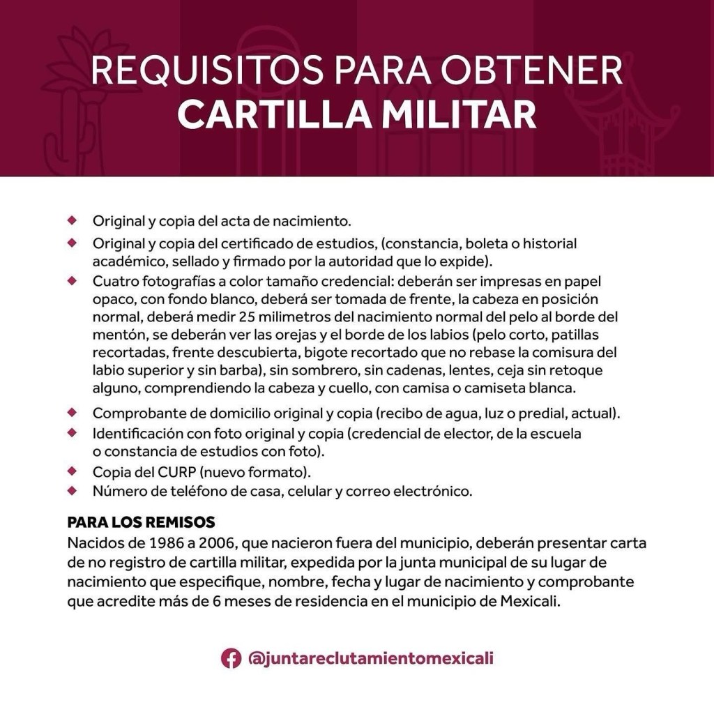 Cabe mencionar que, para aquellos varones remisos, nacidos en este municipio en el año 1986 al 2006, deberán presentar su carta de “No Registro de Cartilla Militar”, expedida por esta Junta Municipal, en donde se especifiquen sus generales, así como un comprobante que acredite su residencia de más de 6 meses en la ciudad.