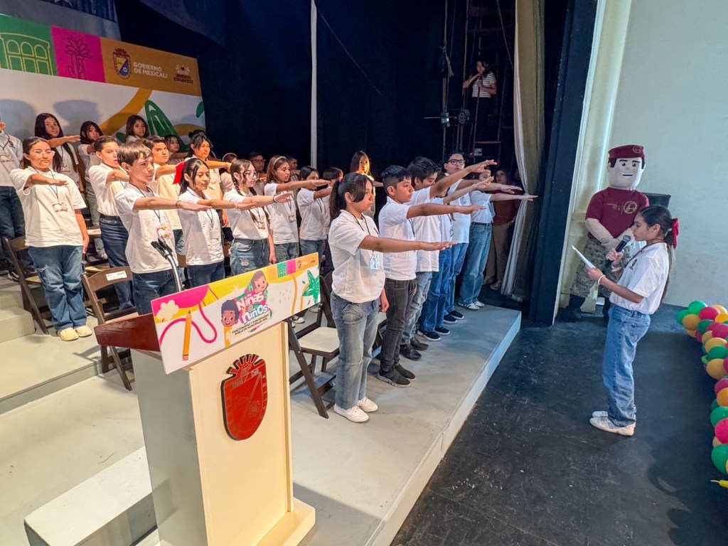 Mexicali B.C. A 30 de abril 2025.- Como parte de las actividades para celebrar el Día de la Niña y el Niño, la alcaldesa de Mexicali, Norma Bustamante, tomó protesta a 52 alumnos de sexto año de primaria como funcionarias y funcionarios públicos municipales.