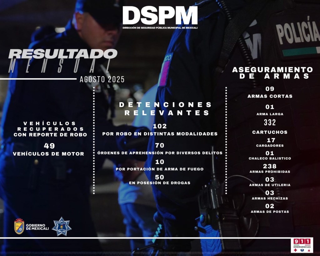 Durante el periodo del 1 al 31 de agosto, la Policía Municipal logró los siguientes resultados: