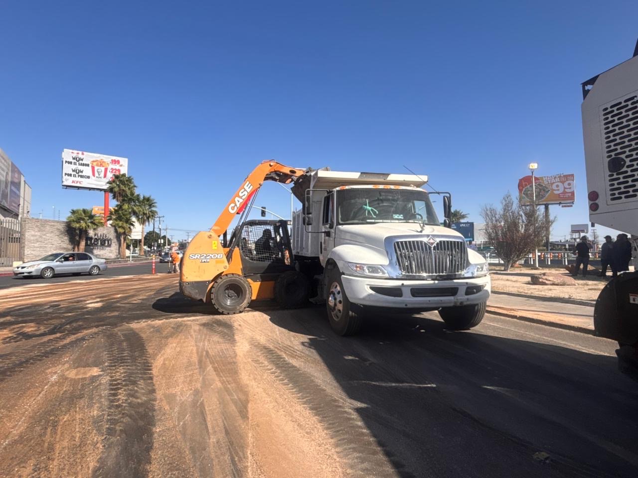 Personal del Gobierno de Mexicali atiende un derrame de aceite en la glorieta de Lázaro Cárdenas, por lo que se encuentran cerrados dos carriles de circulación 🚧.
